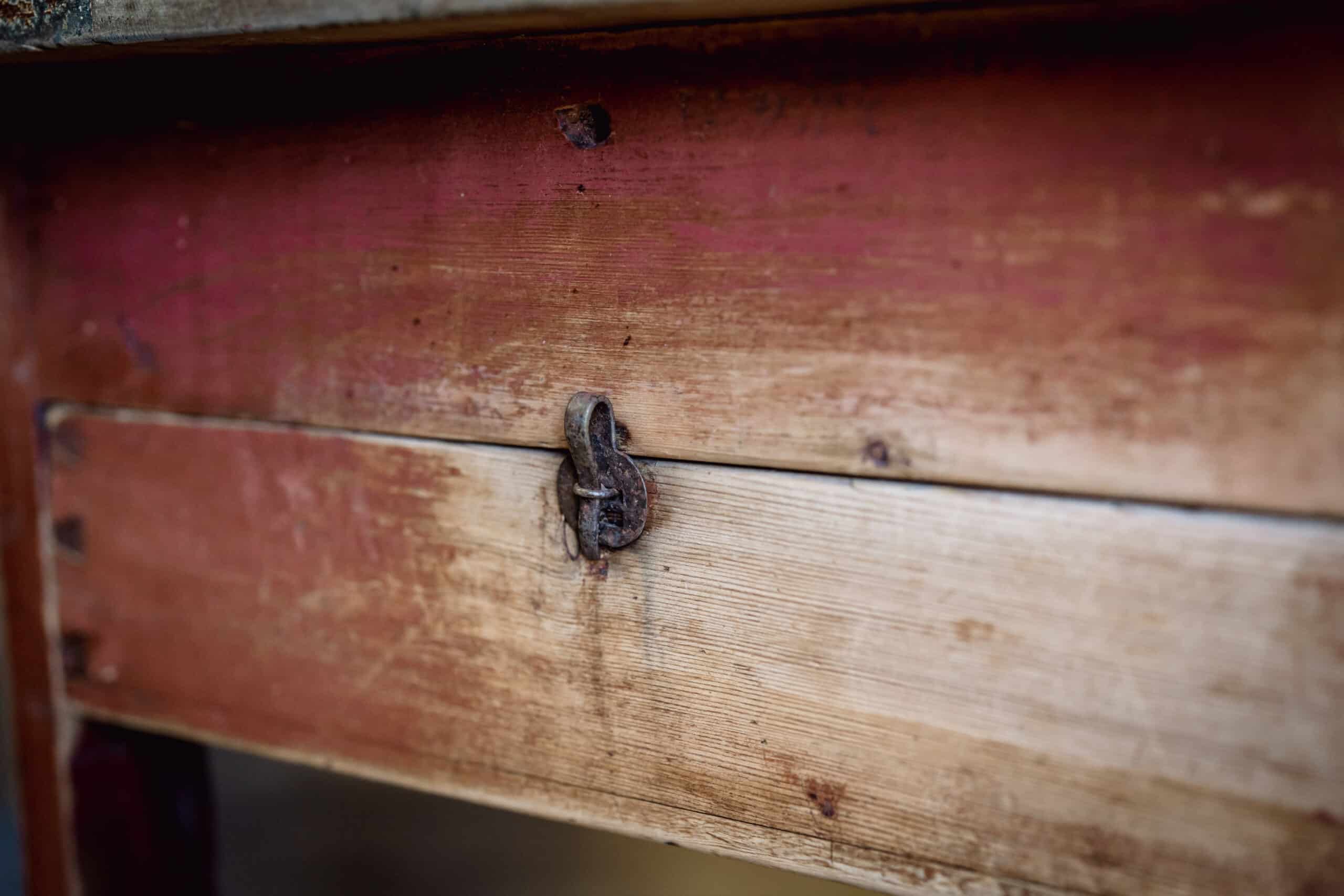 The base has the typical Swedish country furniture colour, faded to a timeworn patina. The base is absolutely original to the top. The drawers are deep and the gate-leg still works perfectly well. The ironwork hinges, hooks and catches are all as they were when the table was made..